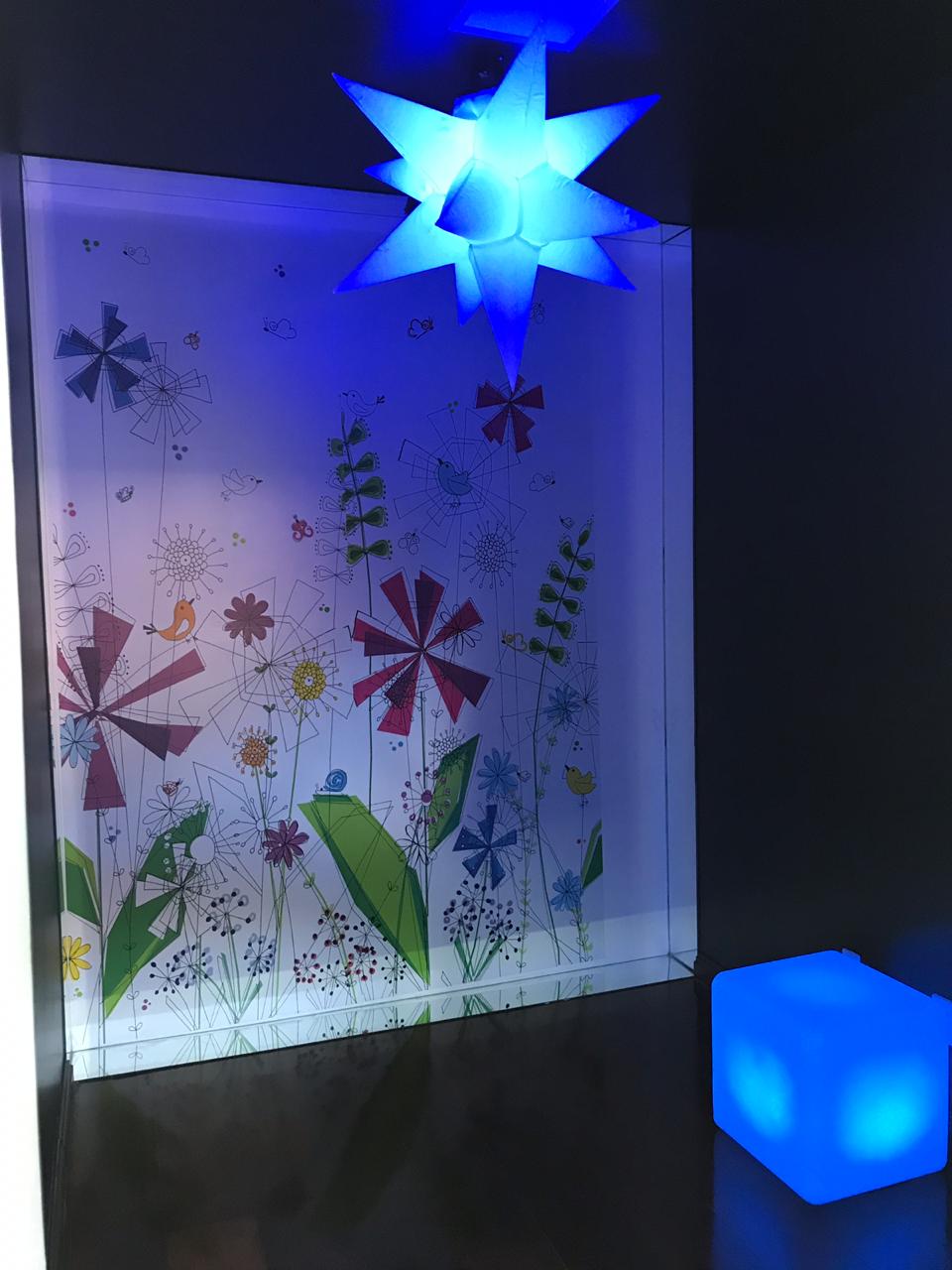 Produtos | Tubo de bolhas Módulo de interface sala branca Módulo de interface sala negra Piso interativo Luz negra Sputnik Painel temático Home Theater |